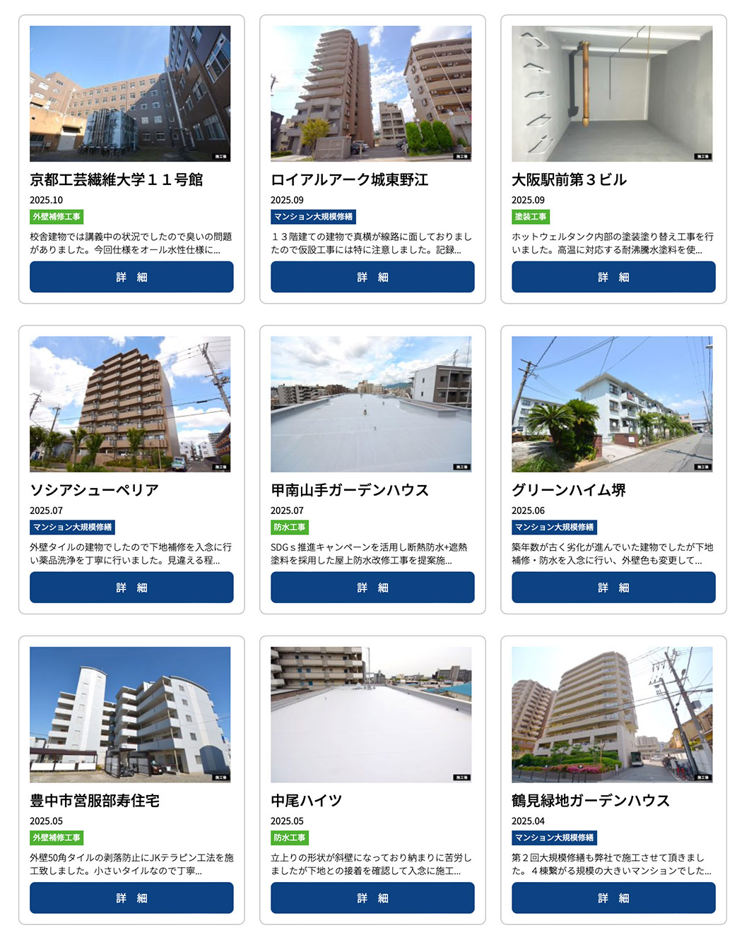 新着情報 最新ニュースやホームページの更新状況などをお知らせする記事を掲載しています。 2025.12.03 お知らせ 施工実績を追加しました。 新しく9件の施工実績を追加しましたので御覧ください。 → 施工実績ページ