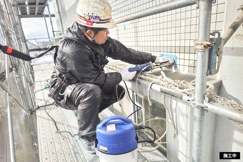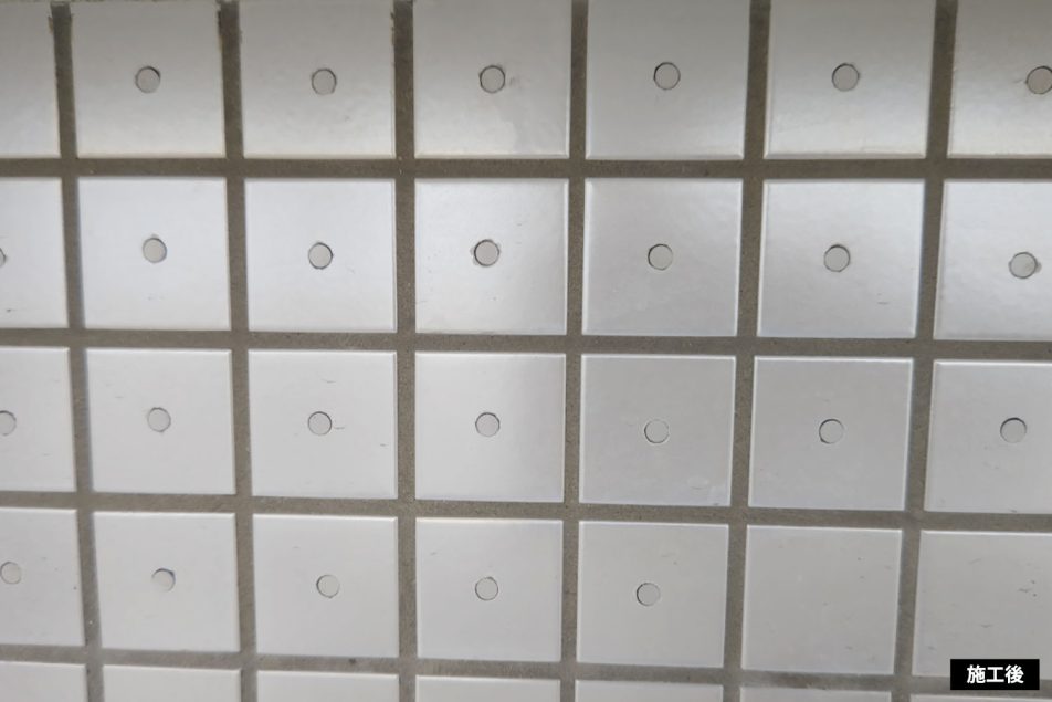 外壁50角タイルの剥落防止にJKテラピン工法を施工致しました。小さいタイルなので丁寧に施工しました。